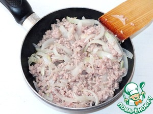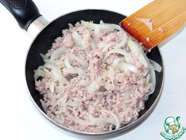 5. Затем добавьте мясной фарш и обжарьте его до полуготовности (до "бела"). Картофель очистите, натрите на крупной терке и выжмите сок.