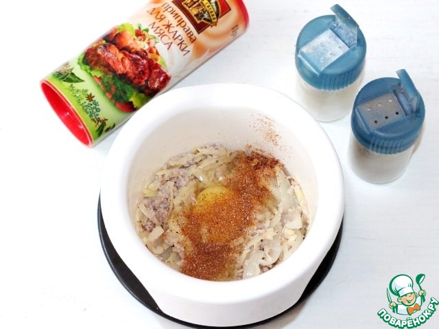 6. Выложите мясной фарш в чашу блендера. Добавьте 0,5 ч. л. приправы для мяса, 1 желток, тертый картофель, очищенную и мелко порубленную дольку чеснока. Посолите и поперчите по вкусу. Измельчите блендером.