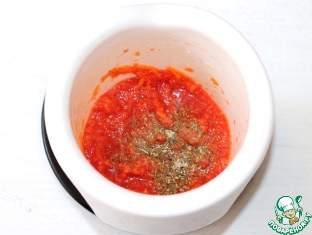 8. Приготовим красный соус. Выложить в чашу блендера очищенный от шкурки и порезанный дольками помидор. Добавляем к помидору приправу (0,5 ч. л.), прессованный зубчик чеснока, очищенную и тертую на крупной терке морковь. Две столовые ложки моркови оставляем.