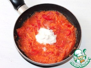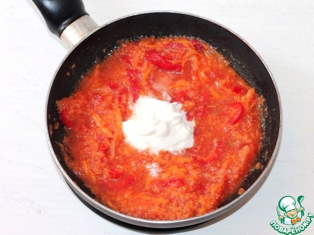 9. В разогретое масло (1 ст. л.) выкладываем помидорную смесь, оставшуюся морковь и порезанный соломкой сладкий перец. Добавляем сметану, соль и молотый перец по вкусу. Тушим до готовности красного перца. Соус готов!