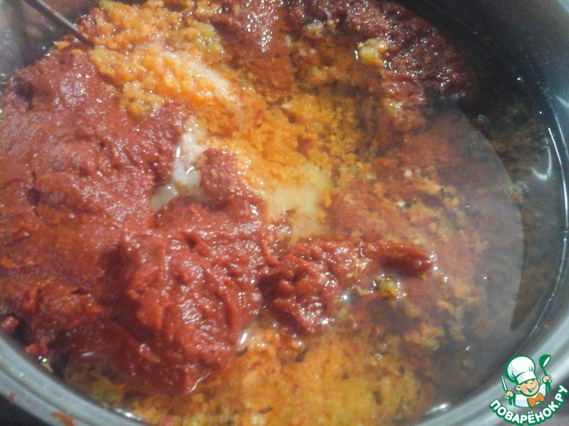Добавить к перекрученным продуктам соль, томат-пасту, растительное масло, сахар, уксус. Хорошо размешать.