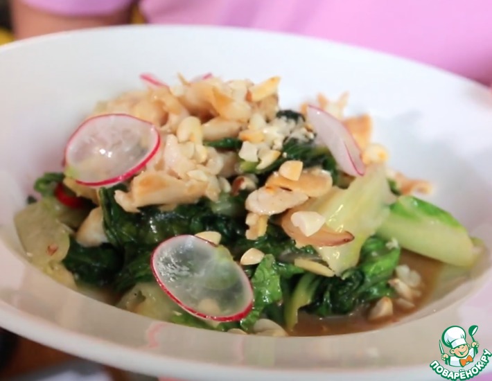 На сливочном масле обжариваем имбирь, лук, чеснок и перец чили. Затем высыпаем в сковороду листья салата и обжариваем.