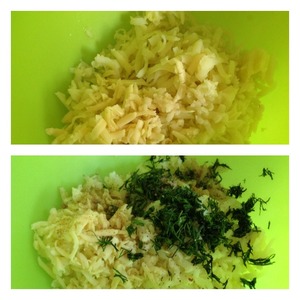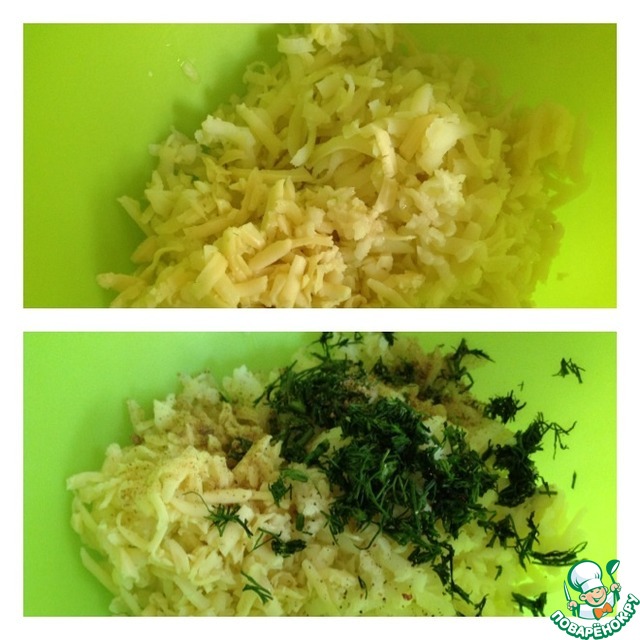 Картофель охладить, очистить и натереть на крупной терке, как и сыр. Чеснок пропустить через пресс. Добавить специи и укроп мелко нашинкованный. Ложкой, а затем руками вымесить фарш.