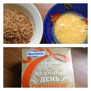 В одну пиалу выложить хлопья, в другую разбить яйцо и взбить вилкой с щепоткой соли.