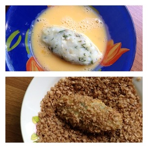 Сформировать котлеты. Сначала хорошо окунуть котлету в яйцо, затем обвалять в хлопьях.
