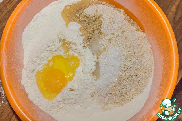 В глубокой миске смешиваем просеянную муку и измельченные хлопья.