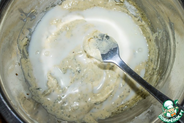 Затем к маслу добавляем сметану, молоко и просеянную муку. Тщательно размешиваем.