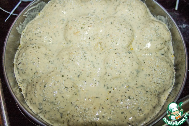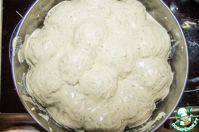 Тесто делим на кусочки по 50-60г, скатываем в шарики и выкладываем в глубокую форму. У меня разъемная форма диаметром 25см.