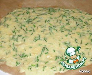 Противень выстлать пергаментом, равномерно распределить сырно-яичную массу.