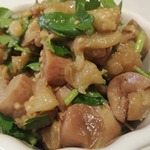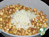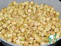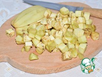 Баклажаны очистить от кожицы, нарезать кусочками примерно такого же размера, что и грибы. |