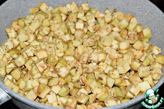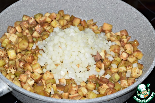 Добавить лук к баклажанам, перемешать, накрыть сковороду крышкой и готовить овощи еще 12-15 минут на среднем огне, помешивая периодически. |