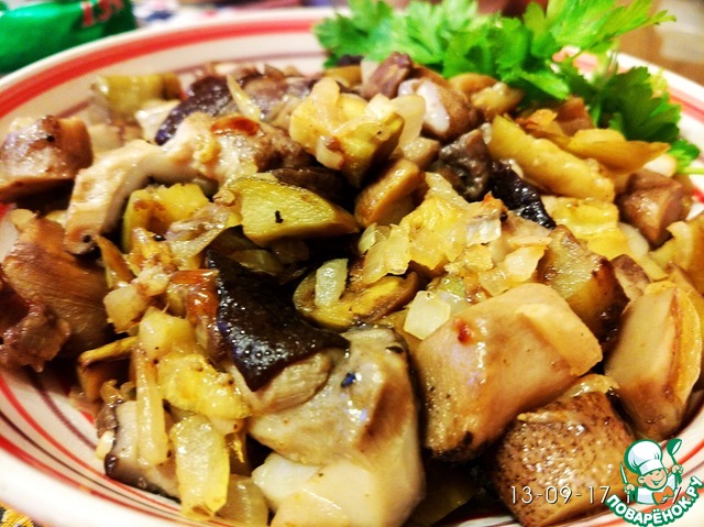 Описание: Согласитесь, жареные грибы-это вкусно. Жареные баклажаны-тоже здорово. А жареные грибы с баклажанами? Вкуснее вдвойне! Попробуйте эту закуску. Просто, быстро, доступно. Почему "Универсальная"? Добавьте к ней мясной фарш или кусочки куриного филе-получите полноценный сытный ужин. Добавьте немного тертого сыра и используйте в качестве начинки для открытого пирога. Положите эту закуску на кусочек черного хлеба-вот вам и легкий перекус. Я даже вареники готовлю с такой начинкой. Чем не универсальная вещь?