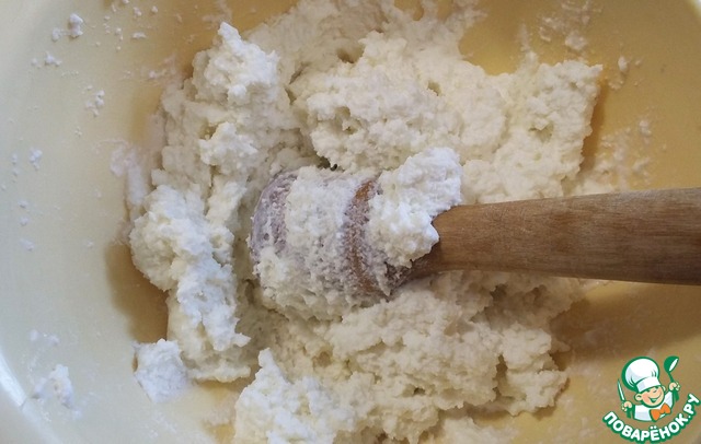 Творог тщательно смешиваем с молоком. У меня в этот раз самодельный творог из козьего молока, так пользы ещё больше. Но это редкость; просто молоко козье проквасила, вот и творог сделала.