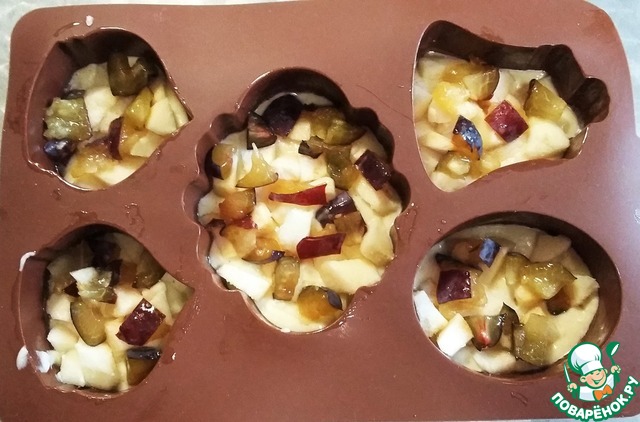 Всё соединяем, работая миксером. Выкладываем половину теста в формочки. Сверху мелко порезанные сливы и яблоко.