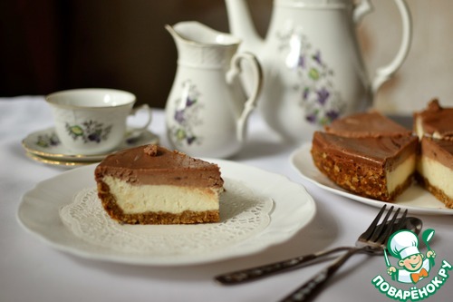 На основу из печенья выложить сначала белую массу, а потом темную. Выпекать 35-40 минут при температуре 160 град. Центр творожника должен слегка подрагивать.