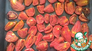 Помидоры помыть, обсушить, порезать дольками, выложить на противень и поставить в духовку на 1,5 часа на 250 градусов, у меня режим конвекции. Следите, чтобы не подгорели, должна выпариться лишняя влага, низ томатов можно немного поджарить.