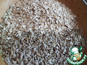 Овсяные хлопья цельно -зерновые ТМ Мистраль и семена подсолнечника высыпать на сухую сковороду.