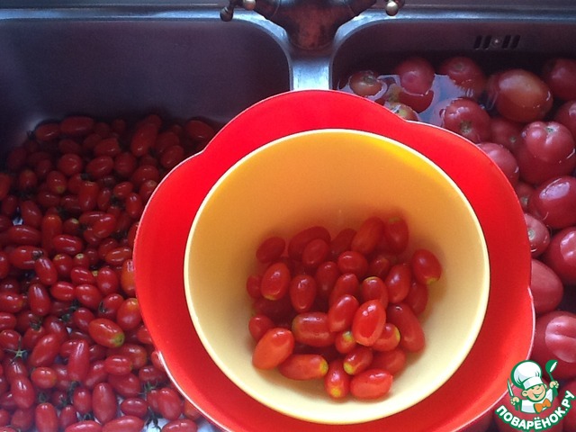 Помидоры замочить в холодной воде, почистить, перебрать, черри отобрать целые, плотные плоды.