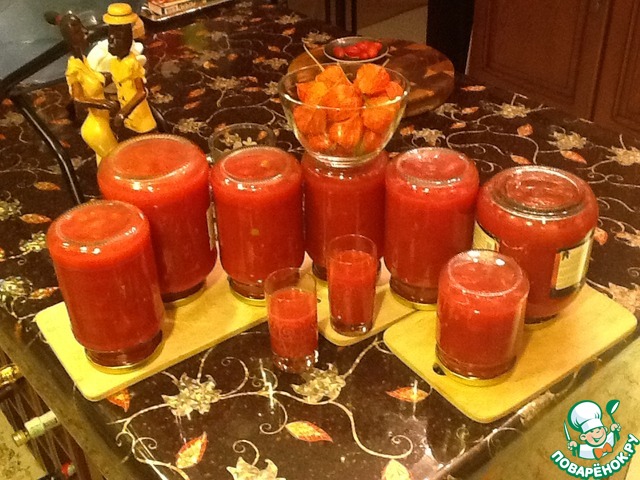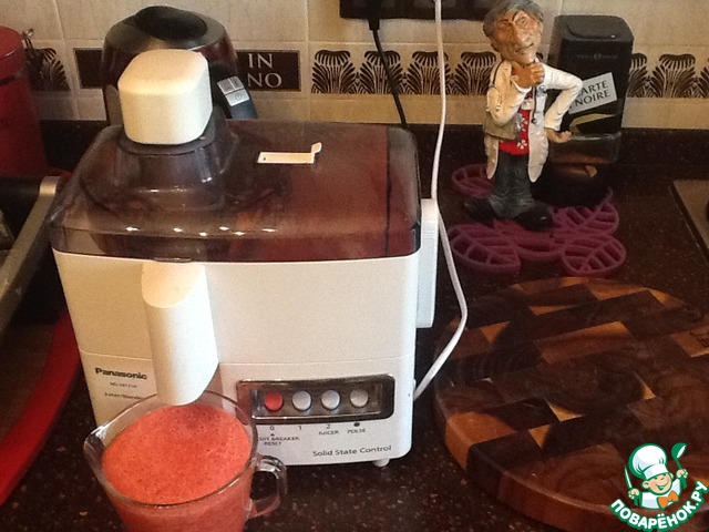 Пропустить помидоры для сока через соковыжималку, не забывая в этот же момент стерилизовать банки.