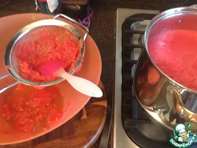 Перетираем жмых через сито силиконовой лопаткой, движениями как делает мазки художник, "втирать и пропустить". То, что выступает через сито этой же лопаткой собираем и выкладываем в кастрюлю, где находится сок. Главное, чтоб кожура не попала в сок. Есть вариант избавиться от кожуры-предварительно ошпарив в кастрюле с водой, но это делает помидоры водянистыми.