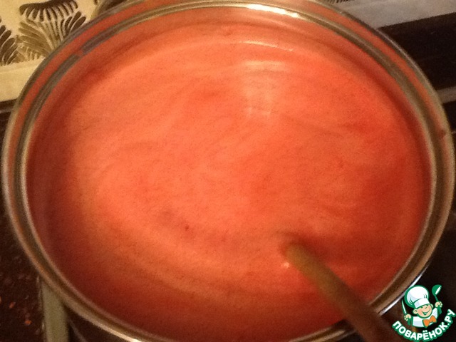 Пока сок варится на маленьком огне, сливаем воду из банок. Крышки опять опускаем в ковшик с горячей водой. За 10 минут до окончания времени готовности сока в кастрюлю добавляем соль, сахар, чуть-чуть сванской соли и... начинаем разливать по банкам. Дальше по стандарту: закрутили, вниз крышкой под одеяло до остывания. Аромат передать не могу, а цвет и густоту видно на фото. Хочу добавить, что из томатов вида "черный принц" такой сок не получается.
