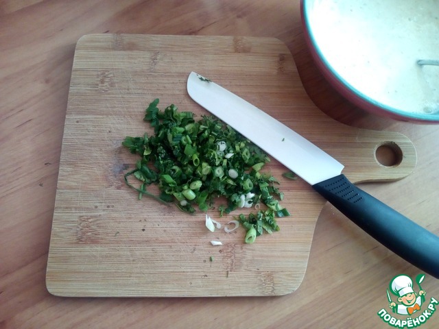 Порубила мелко зелень и выложила её в тесто. Перемешала.