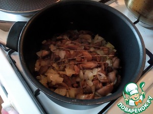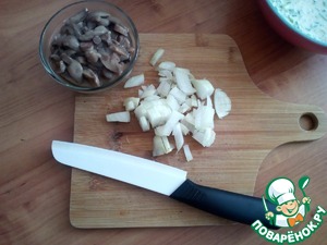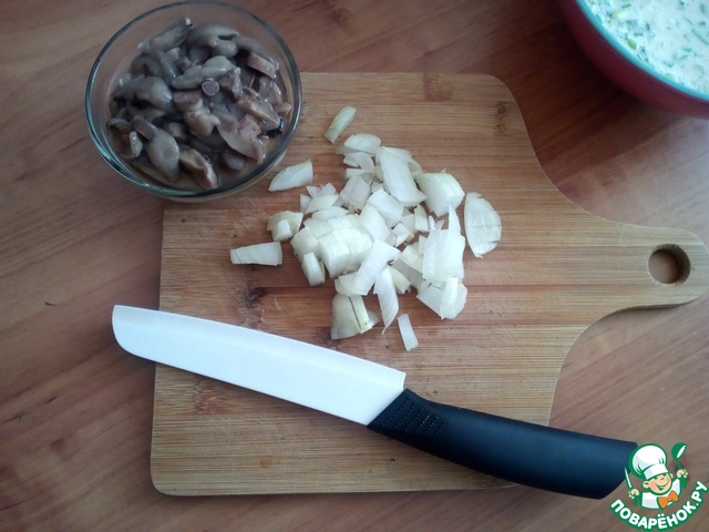 Отставила тесто в сторону и сделала начинку. Маслята у меня уже были отварные. Порезала мелко лук.