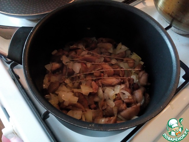 Отправила лук в сотейник с растопленным сливочным маслом. Позолотила его и выложила маслята. Сделала всё до готовности лука и полного выпаривания жидкости из грибов. Больше томила, чем жарила. Минуты за две до готовности положила в грибы 4 веточки тимьяна, которые затем убрала (выбросила). Начинка готова.