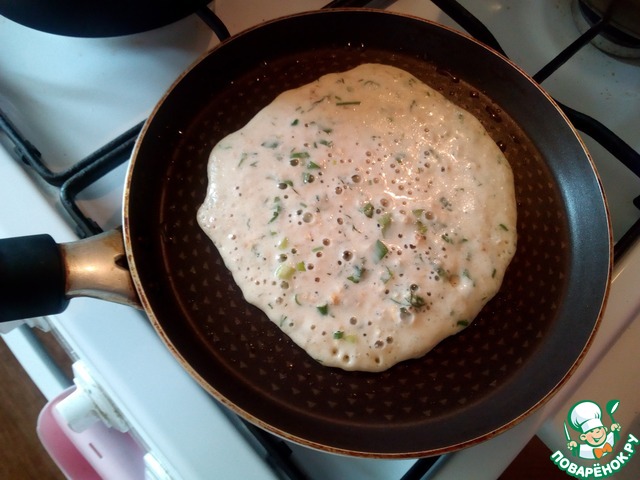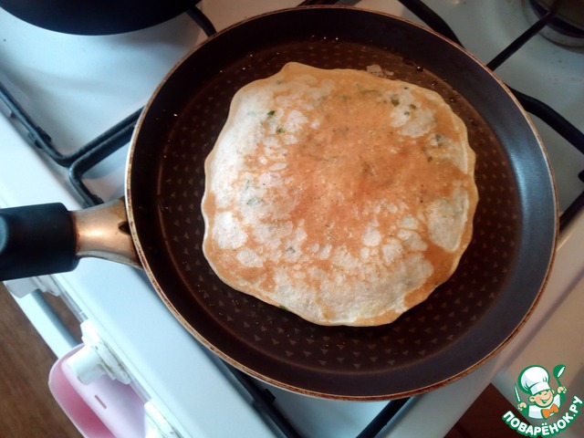 Печём блины. Блины толстые. На один блин по 2/3 поварёшки. Сковороду на первый блин подмазала. Обжариваем блин с одной стороны.