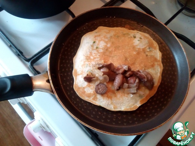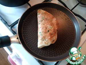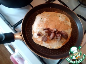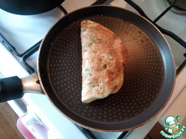 Когда другая сторона обжарится до красивого цвета, перегибаем блин, закрыв полностью начинку. Доделываем блин до готовности. Это быстро. Нужно блин попереворачивать с одной стороны на другую пару раз.
