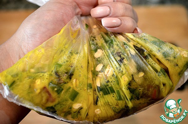 Добавить яйца, молоко, посолить и туго завязать пакет. Перемешать всё руками прямо в пакете.