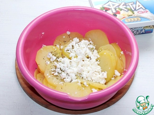 • 1. Очищенный картофель нарезаем тонкими кружочками (~0,5 см) и отвариваем в подсоленной воде до полуготовности. Затем отвар сливаем, картофель выкладываем в миску.