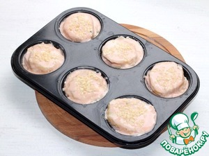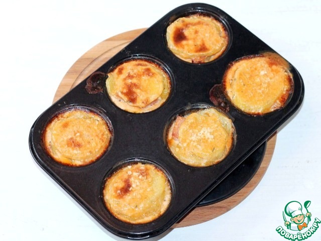 • 6. Выкладываем в формочки пластины картофеля, затем пластины окорока (по 2 шт на формочку) и закрываем картофелем.