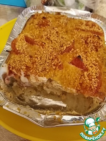 спасибо. интересное блюдо. сделала в фольгированной формочке. внизу панировка, слой картоф пюре. сосиски кружочками, карт пюре. залила вашей смесью. все хорошо пропиталось. а сверху резанные помидорки и снова панировка. пропеклось отлично 40 мин. плюс 5 мин для корочки.