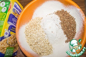 В глубокой миске смешиваем просеянную муку, овсяные хлопья и набухшую гречку.