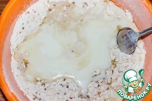 В мучную смесь добавляем кефир, соль, масло и растворенные дрожжи.