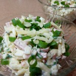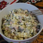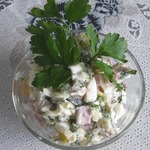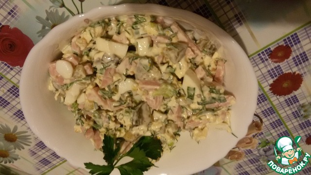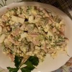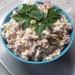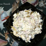 Сочный, нежный, в меру пикантный салат. Вкусный и сытный. Таким салатом можно побаловать свою семью в выходной день, да и на праздничном столе он будет достойно выглядеть. Угощайтесь!