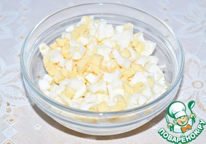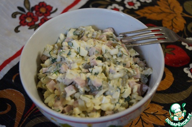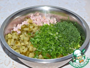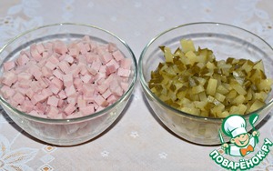 Ветчину и маринованные огурцы нарезать мелким кубиком.