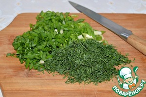 Зеленый лук и зелень (укроп и петрушку) измельчить.