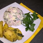 [+5]Замечательный салат! Готовится просто и быстро,съедается ещё быстрее(извини,небольшое изменение было-вместо сыра чуть -чуть картофеля добавила )! Салат ушел на ура!(больше и громче всех( ура !)кричала я!)Спасибо преогромнейшее за салат,Машунечка!