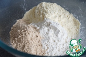 Смешайте муку всех видов, сахар, соду, разрыхлитель, соль.