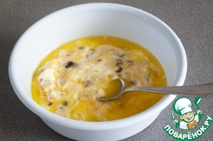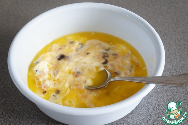 • Отдельно смешайте сметану, яйца, мёд, масло. Добавьте сухофрукты. Вместо них можно использовать измельченные орехи.
