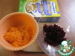 • Морковь, свеклу помыть и натереть в разные миски на мелкую/среднюю терку.