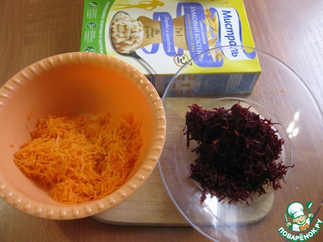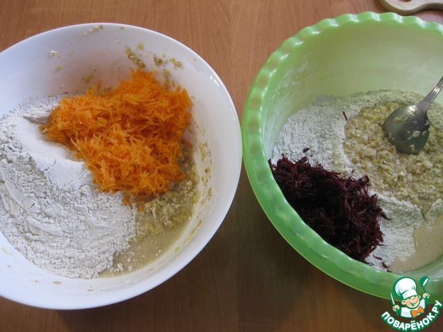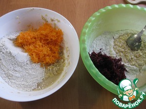 • К муке в большой миске добавить половину хлопьев и морковь, а к оставшимся хлопьям вторую порцию муки и свеклу, вот так примерно)