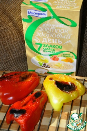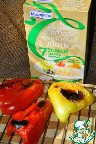 Перцы запечь до готовности, кожица должна обуглиться и легко сходить с них. Очистить перцы от кожицы и семян.