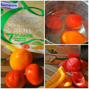 Затем сделаем томаты конкассе. У помидора сделать два надреза - крест на крест. Затем помидор положить в миску и залить кипятком. Помидор оставить в кипятке около 1 минуты. Помидор очистить от кожицы, нарезать на 4 части и вырезать сердцевину (семена).