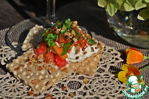 Выложить слоями: овощи, рикотта, гранола. Слои повторить. Завершить овощами и присыпать гранолой.