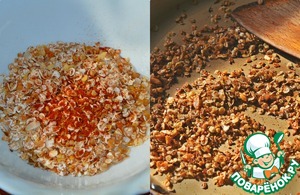 Для гранолы смешайте в миске все сухие ингредиенты. Добавьте масло и тщательно вотрите его руками в смесь из хлопьев и пряностей. На одной из конфорок разогрейте сковороду. Регулярно перемешивая, жарьте хлопья пока они не приобретут приятный кремовый оттенок. -