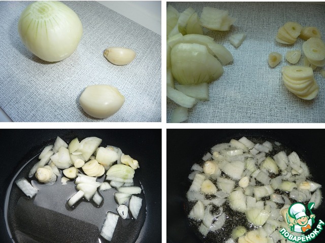 Лук нарезать небольшими кубиками, чеснок слайсами.