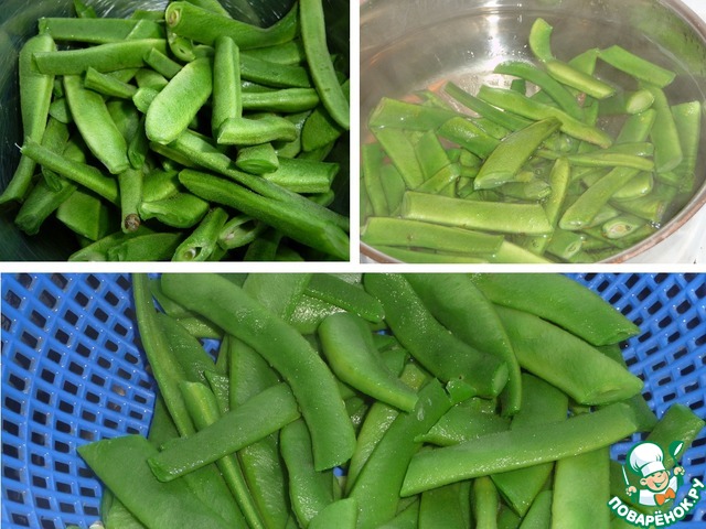 Стручковую фасоль помыть, нарезать на несколько частей, отварить в подсоленной воде до мягкого состояния, около 5-7 минут.